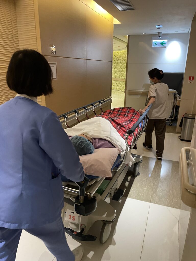 記得即將要入手術室個一個朝早,我一早六點就起左身準備,姑娘幫我著好壓力襪,我就換好手術袍,坐係床邊等,我其實個心真係好忐忑又有小小驚,等左差唔多七點,R先生都嚟到醫院陪我落去手術室,但因為全身麻醉關係,R先生就無得入手術室,佢就係手術室出邊等我。